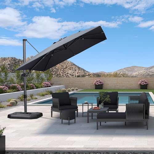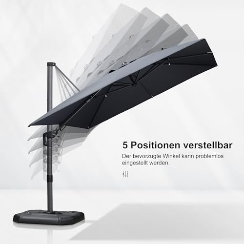 Mit neuartig verbesserter Schwenkgriff drehen das Dach nach alternativ oder rechts, um den ganzen Tag Abschirmung vor Sonnenstrahlen zu bieten. Per Drehteller mit Fußpedal um 360° drehbar.