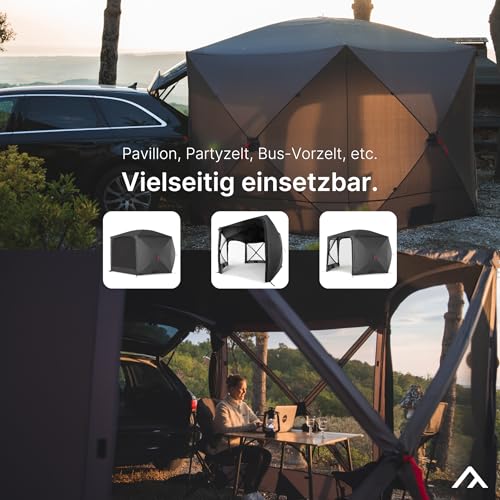 VARIABEL: Hinsichtlich tolle Raumgeometrie abwandelbar nutzbar wie Gartenpavillon, Campingpavillon, Partyzelt, Vorzelt, Busvorzelt