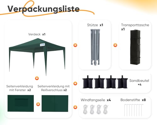 Lieferumfang: 1x Pavillon + 2x Seitenwände mit Reißverschluss + 2x Seitenwände mit Fenster + 4x Sandsack + 1x Tragetasche 600D Oxford + 8x gemahlene Nägel.