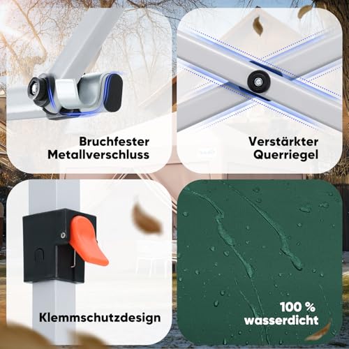 Höhenverstellbar und viel Platz: Das Outdoor-Faltzelt hat 3 verstellbare Höhen: 245 / 255 / 265 cm. Sie können die Höhe wählen, die Ihren Bedürfnissen am besten entspricht. Die Länge und Breite des Gartenpavillons beträgt 3 m und bietet eine schattige Fläche von 9㎡ für 10 Personen oder ausreichend Platz für einen Tisch.