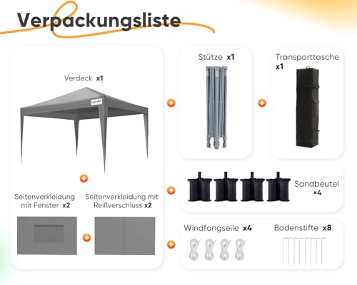 Lieferumfang: 1x Pavillon + 2x Seitenwände mit Reißverschluss + 2x Seitenwände mit Fenster + 4x Sandsack + 1x Tragetasche 600D Oxford + 8x gemahlene Nägel.