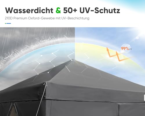 2 in 1 Quictent Faltpavillon: Das Pavillondach besteht aus speziellem 210D Oxford 100 % Polyester, silber pulverbeschichtet, wasserdicht und UV 50+ geschützt, mit 4 abnehmbaren Seitenwänden, davon 2 mit Reißverschluss und 2 mit Moskitonetzen. Ob im kalten Winter oder im heißen Sommer, dieser Gartenpavillon kann zu jeder Jahreszeit genutzt werden.
