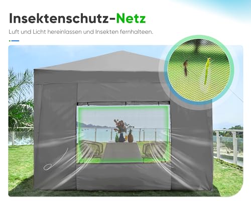 Quictent Pavillon 3×3 mit 4 Seitenteilen, Faltpavillon mit Entlüftung Wasserdicht Stabil Winterfest, Pop up Gartenpavillon mit 4 Sandsäcke,Grau