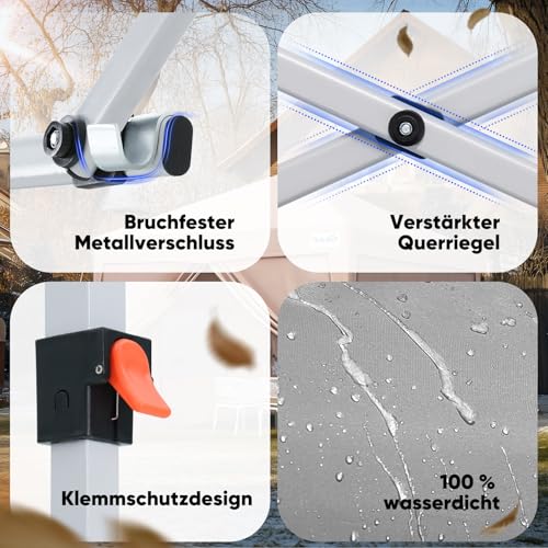Höhenverstellbar und viel Platz: Das Outdoor-Faltzelt hat 3 verstellbare Höhen: 245 / 255 / 265 cm. Sie können die Höhe wählen, die Ihren Bedürfnissen am besten entspricht. Die Länge und Breite des Gartenpavillons beträgt 3 m und bietet eine schattige Fläche von 9㎡ für 10 Personen oder ausreichend Platz für einen Tisch.