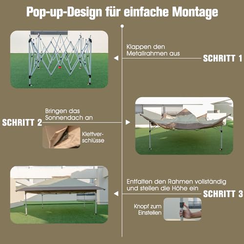 ★ Einfacher Aufbau & Transport ★ Dank des Pop-up-Designs kann das Gartenzelt mit wenigen Schritten aufgebaut werden. Bekannt als die Höhe des Zeltes kann je nach Bedarf abgestimmt werden (264/274/284 cm). Bei Nichtgebrauch lässt es sich schnell zusammenfalten und in einer Tragetasche mit Rädern stattdessen den einfachen Transport verstauen.