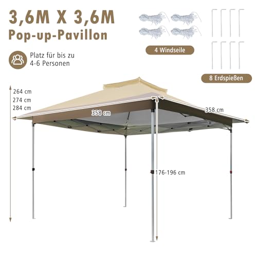 ★ Mit Doppeltem Dach ★ Das doppellagige Dach bietet eine zirkulierende Belüftung für eine bessere Luftzirkulation und ein kühles und erfrischendes Erlebnis. Der Faltpavillon misst 360 x 360 cm und bietet großzügigen, geschützten Platz für 4-6 Personen und Ihre Terrassenmöbel.