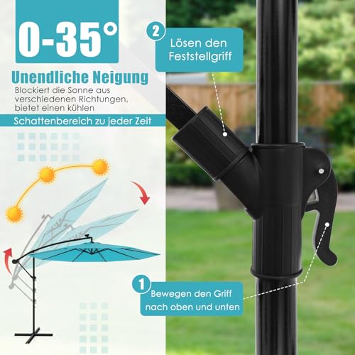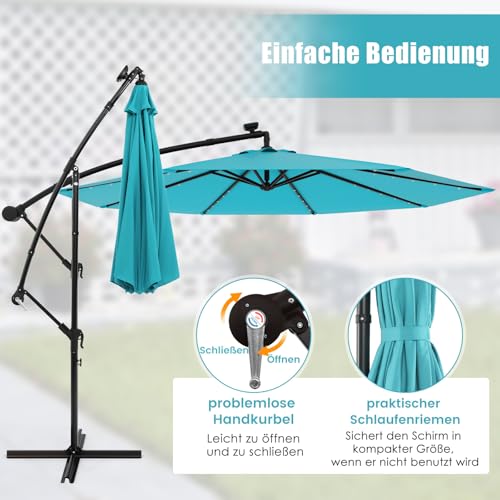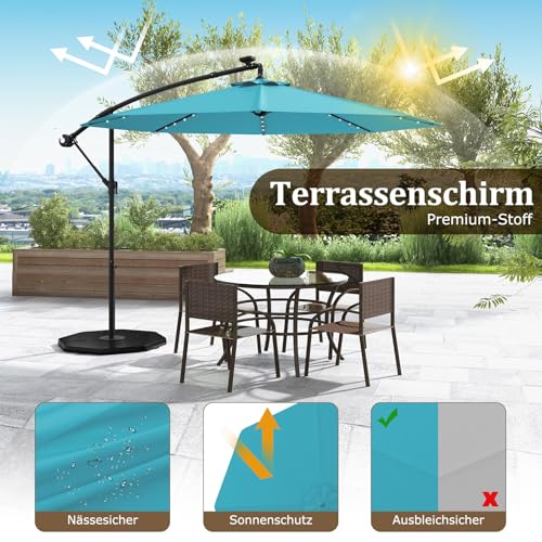 Ausgestattet mit 40 LED-Leuchten, die über das mitgelieferte Solarpanel mit Strom versorgt werden, beleuchtet der Ampelschirm die Umgebung in dunklen Umgebungen. An einem sonnigen Tag kann das Solarpanel nach 4 Stunden lückenlos aufgeladen werden. Also können Sie nachts 7 Stunden lang Licht genießen. Die Sicherheiten besteht jedweder Polyestergewebe, das Sie vor Sonnenlicht und leichtem Regen schützt. Darüber hinaus verfügt der solarbetriebene Ampelschirm für die Terrasse über eine Neigungsverstellung, sodass Sie ihn mühelos an die Bewegung der Sonne gleichsetzen können, um optimale Beschattung zu erzielen. Immerhin die wahre Magie liegt in seinem Kurbelöffnungsmechanismus, der eine mühelose Bedienung beim Öffnen und Induzieren des Schirms gewährleistet.