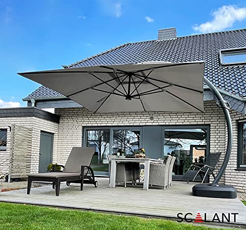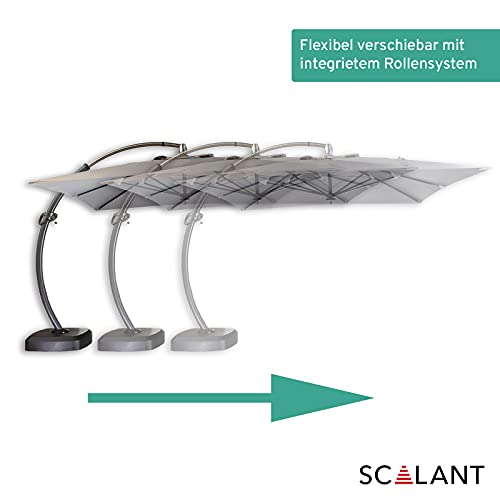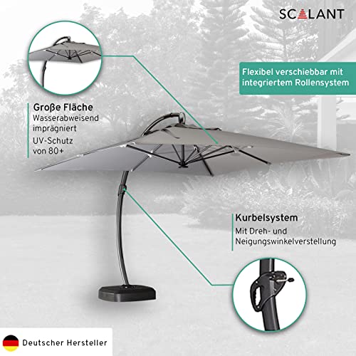 FUNKTIONEN: Wunschlos glücklich – restlos begeistert. Leichte Dreh- und Neigungsverstellung schützen Sie anpassungsfähig vor der Sonne und falls Sie den Scalant Sonnenschirm verschieben müssen, ist dies dank des integrierten Rollensytems im Handumdrehen erledigt. Maße: Sonnenschirm: 350cm x 350cm. Höhe: 300 cm.
