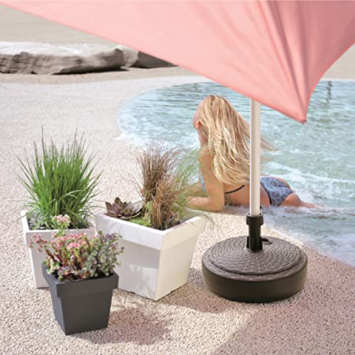 Ansehnlich langlebig, leer witterungsbeständigem, einschließlich UV-Strahlung, weiterhin strapazierfähigem Kunststoff. Der Schirmständer passt auf einen Gartenschirm oder Mast unter Einsatz von einem Durchmesser von 24 bis 30 mm. Es hat einen abnehmbaren Reduktionsstift.