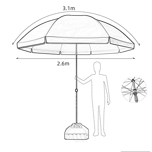 Dieser stilvolle große Gartenschirm hat einen Durchmesser von 3,1 Metern und eine Gesamthöhe von 2,5 Metern. Es hat dichte Schatten und bietet Platz für 5-6 Personen unter dem Schirm.