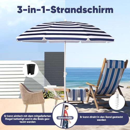 3-in-1-Sonnenschirm Für Balkon & Strand: Sonnenschirm, Sandanker & Schutzhülle. Dank Passstück-Clip ermöglicht die Montage auf Sonnenschirmständer. Mit dem speziell entwickelten Schraubsystem lässt sich der Sonnenschirm einfach im Sand katalysieren. Die platzsparende Schutzhülle macht ihn zum idealen Begleiter für Strand und Garten!
