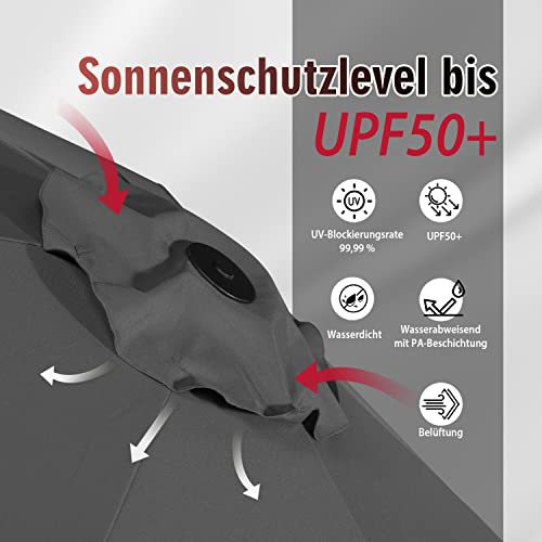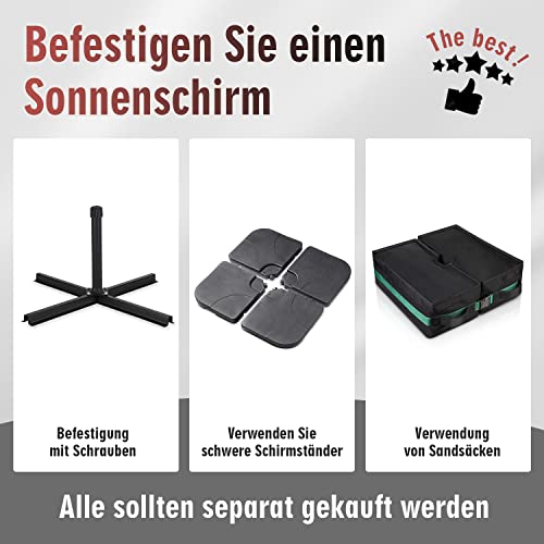 Dieser Sonnenschirm bietet durch sein Design wie Doppelsonnenschirm besseren Abschirmung vor tiefstehender Sonne sowie guten UV-Abschirmung.Der Polyesterfaser-Schirmbezug 100% Wasserfestigkeit,lässt sich leicht abklingen und kann gewaschen werden;