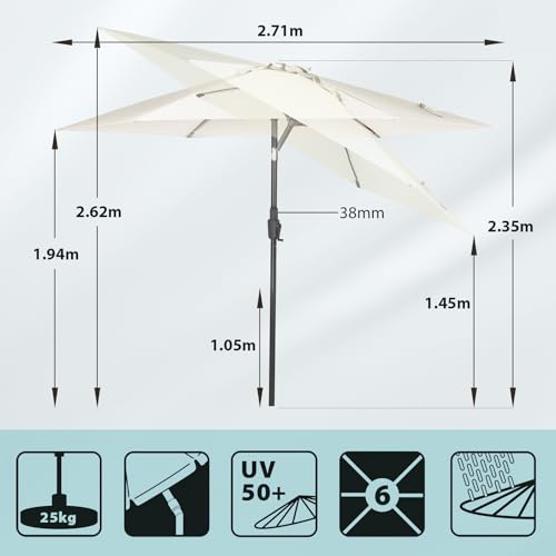 Abmessungen & Material – Größe: 271 cm, Schirmhöhe: 235 cm, Durchmesser der Stange: 38 mm, Schirmbezug aus 100 % Polyester; ca. 160 g/m².