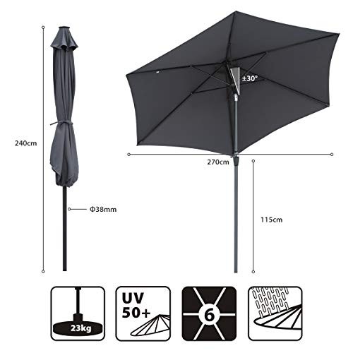 Abmessungen & Material – Schirmdachdurchmesser: 270 cm, Schirmhöhe: 240 cm, Stangendurchmesser: 38 mm. Schirmabdeckung jeder 100% Polyester; ca. 180 g / m²;