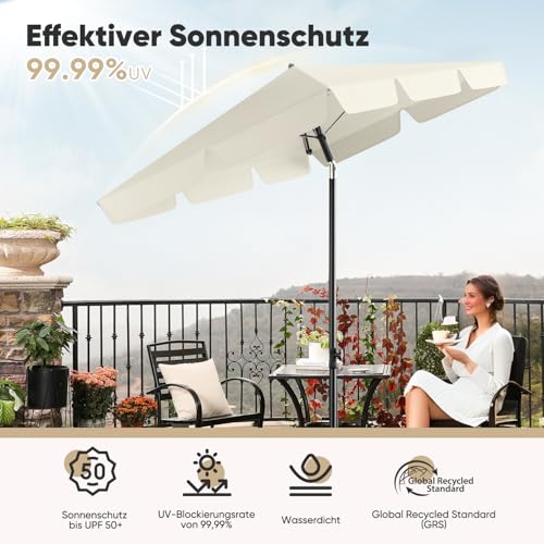 UPF 50+ & HOCHWERTIGE MATERIALIEN-Schirmbezug: 100% Polyester (180 g/m², wasserabweisend) + GRS-zertifiziert (80% recycelte Fasern, 45% minus CO2).Maximale UV-Verteidigung – stilvoller Abschirmung stattdessen Ihren Balkon!