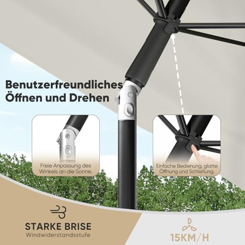 INDIVIDUELL ANPASSBAR: HÖHE & NEIGUNGSWINKEL-Drehknopf-Mechanismus: Stellen Sie die Höhe des Schirms von 150 cm bis 235 cm ein.Separater Neigungsmechanismus: Kippen Sie den Schirm um bis zu 30°, um den perfekten Schatten zu genießen – ob morgens beim Kaffee oder abends beim Grillen!