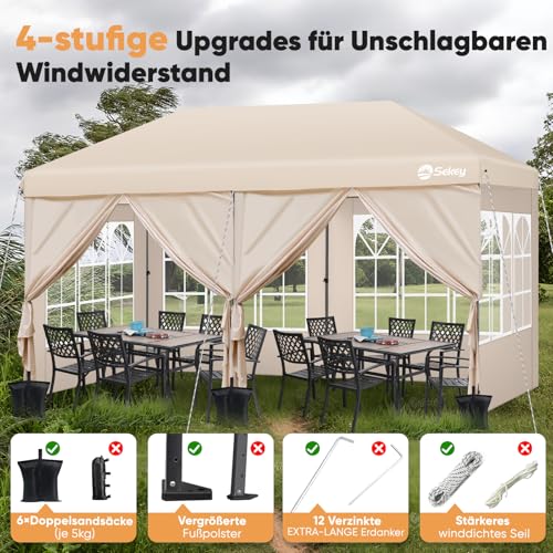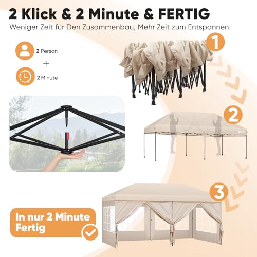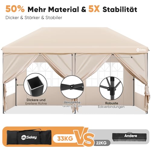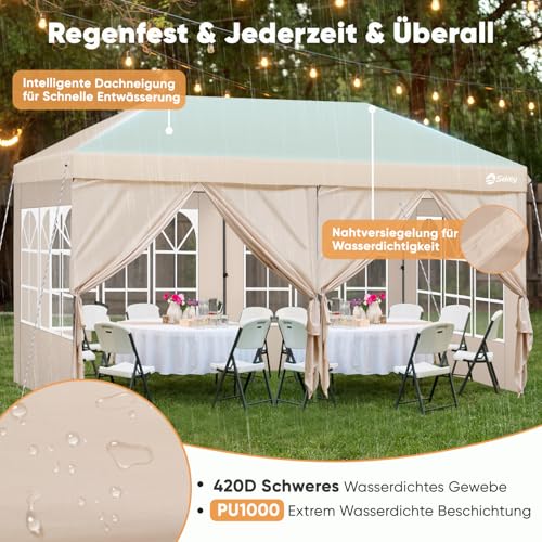 Sekey One-Touch Pop Up Pavillon 3×6 mit Seitenteile, Partyzelt Faltpavillon 3x6m Wasserdicht Stabil, Vereinfachte Installation in 1 Minute, Robust Windfest Regenfest für Camping Festival Party,Kahki
