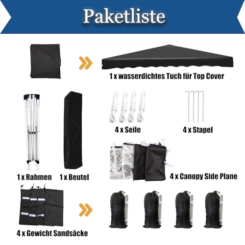 【Das Paket enthält】 1x Pavillon Gestell + 1x Pavillondachtuch + 1x Handtasche + 4x Zeltheringe + 4x Sandsack+ 4x Abspannleinen + 4x Seitenwände + 1x Anleitung