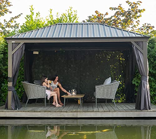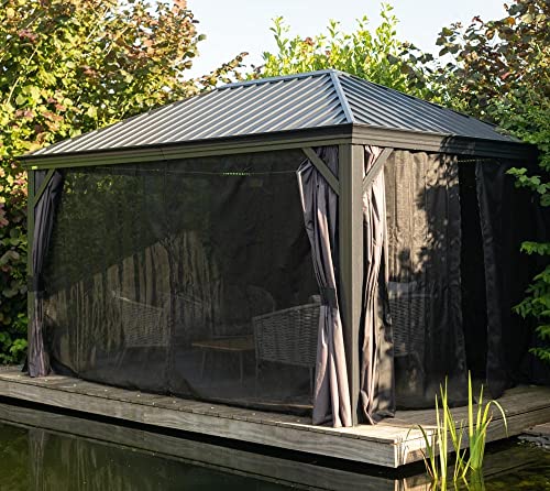 Sojag Alu Pavillon Marsala 1216 | Hardtop Pavillon mit Moskitonetz | Anthrazit | 363x483x293 cm Klassischer Pavillon mit optimalem Zubehör – der Pavillon Marsala 1216 von Sojag punktet mit funktionalen Features und ist der Blickfang deines Gartens! Gibt es etwas Besseres, als bei Wind und Wetter die Zeit im Garten zu verbringen? Egal ob du dein Frühstück an der frischen Luft genießt, den Nachmittag mit einem spannenden Buch verbringst oder mit Freunden gesellige Abende feierst – im Freien macht einfach alles mehr Spaß! Mit dem Pavillon Marsala 1216 von Sojag kannst du deine Zeit im Garten problemlos verlängern, denn er bietet dir zuverlässigen Schatten und sorgt für eine erholsame Draußenzeit. Cleveres Design, zuverlässige Beschattung, maximaler Sonnenschutz! Pavillondesign – klassisch, aber neu interpretiert! Der hochwertige Pavillon Marsala 1216 überzeugt durch seine Multifunktionalität und die robuste Konstruktion: Die tragende Konstruktion besteht aus Aluminium und fußt auf soliden Balken. Das Dach ist aus galvanisch verzinktem Stahlblech gefertigt uns trotzt Wind und Wetter zuverlässig. Zusätzliches Feature: Der Pavillon wird mit Moskitonetzen geliefert und ist mit zweigleisigen Laufschienen ausgestattet. Dadurch kannst du Moskitonetze und Vorhänge gleichzeitig nutzen. Passende Vorhänge sind als optionales Zubehör in unserem Shop erhältlich. Die Highlights auf einen Blick: Traditionelles Design: Klassischer Pavillon mit praktischem Zubehör! Massive Konstruktion aus Aluminium Optimaler Moskitoschutz dank rundum angebrachter Moskitonetze aus Nylon Zweigleisige Laufschienen zum gleichzeitigen Aufhängen von Vorhängen (optional erhältlich) Solide Dachkonstruktion aus Stahlblech. Cleveres Entwässerungssystem: Regenrinnen sind in Pfosten implementiert. Für den ganzjährigen Außenbetrieb konzipiert! Aufbau und Montage: Der Pavillon ist einfach zu montieren und wird mit einer ausführlichen Aufbauanleitung geliefert. Für den Aufbau benötigst du ha…