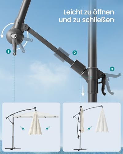 [Einfaches Öffnen und Einstellen] Durch Drehen der Kurbel lässt sich der Schirm einfach öffnen und abstrahieren. Verstellen Sie den Neigungswinkel des Sonnentuchs je nach Tageszeit, indem Sie den Verriegelungsmechanismus am Mast nach oben oder hinab schieben