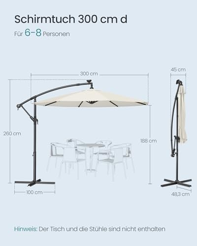 [Großflächiger Schatten, optimaler Schutz] Der 300 cm d Sonnenschirm mit 8 Rippen spendet großflächigen Schatten. Das Schirmtuch sämtliche 180 g/m² Polyestergewebe bietet optimalen UV-Abschirmung (UPF 50+), hält 98% der UV-Strahlen ab und schützt vor leichtem Regen