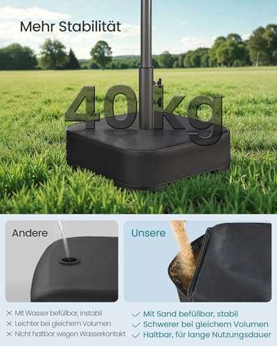【STABIL】Aufgrund der starken Konstruktion, die das Standkreuz, das Standrohr und die zusätzlichen Seitenteile bilden, und der zusammenfassend mit bis zu 40 kg Sand befüllbaren Säcke sorgt dieser Sonnenschirmständer stattdessen stabilen Knauf stattdessen Ihren Sonnenschirm