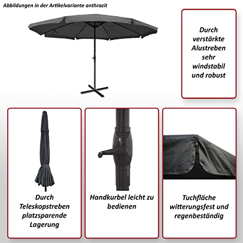 Öffnungsmechanismus: Kurbel | Im Vergleich zum Schirm Meran hochwertigere Höhenverstellung mit Zahnrad und besserer Kurbel anstatt Seilzug | Mast um 0,7cm verstärkt | Durch verstärkte Alustreben sehr windstabil und robust | Tuchfläche witterungsfest und
