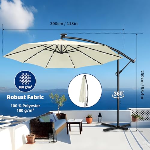 Genießen Sie entspannte Stunden im Freien mit unserer hochwertigen Markisen-Garten-Sonnenschirm in zwei Größen (⌀ 300 cm oder 350 cm) und wahlweise mit praktischer Solar-LED-Beleuchtung für gemütliche Abendstunden. Der Schirm bietet mit seinem UPF 50+ zertifizierten Polyestergewebe (180 g/m²) optimalen Abschirmung vor schädlicher UV-Strahlung – 98 % der Sonnenstrahlen werden blockiert! Das Material ist wasserabweisend, farbecht und ideal für Garten, Terrasse, Balkon oder sogar gastronomische Nutzung.