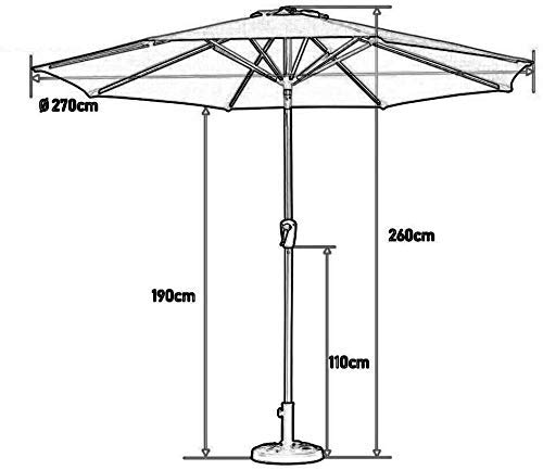 Größe: 270 cm. Die starke Metallstange macht den Sonnenschirm ausgesprochen zäh und langlebig.