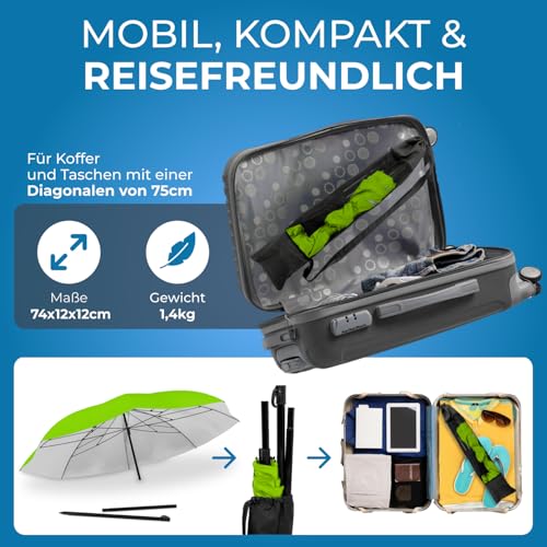 🧳 PACK MICH EIN – So kompakt, dadurch er in Deinen großen Koffer oder Reisetasche (mind. 75 cm Diagonale) passt. Unser Reise Sonnenschirm ist der perfekte Ware statt dessen Deinen nächsten Strandurlaub!
