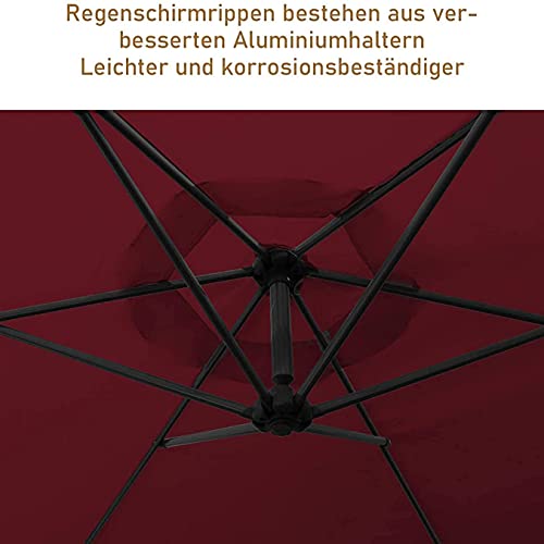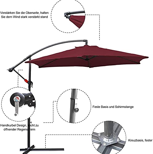 MERKMALE: 1. Stabiler Standfuß und Streben – Der mitgelieferte Standfuß bietet ausreichend Stabilität und kann mit rechteckigen Platten individuell verstärkt werden 2. Stufenlos verstellbarer Neigungswinkel – Freischwebender Schirm mit 8 Streben inkl . Handkurbel zum einfachen Spannen Stufenlos einstellbar in verschiedenen Neigungswinkeln, bietet durchgehenden Abschirmung bekannt als außerhalb des Tages 3. UV-Abschirmung – Die Schirmhülle bietet über 40+ UV-Abschirmung, damit Sie an heißen Sommertagen einen kühlen Schatten genießen können