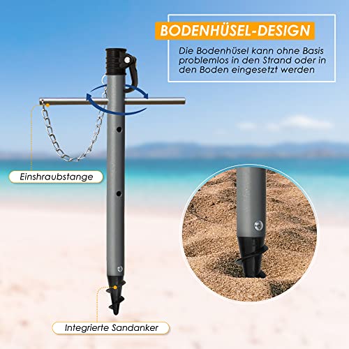 【2022 UPGRADE Sandanker】 – An der Unterseite der unteren Stange befindet sich ein Sandanker, mit dem Sie den Sonnenschirm Strand leicht in den Sand drehen können. Mit Hilfe des Metallhebels oben auf dem Unterstange lässt sich der Stange einfach in den Sand schrauben. Der 2-in-1 Sonnenschirm kann ohne Basis fest am Boden befestigt werden.