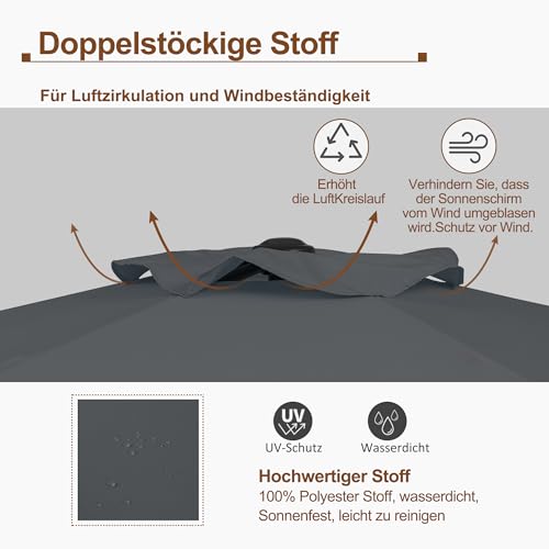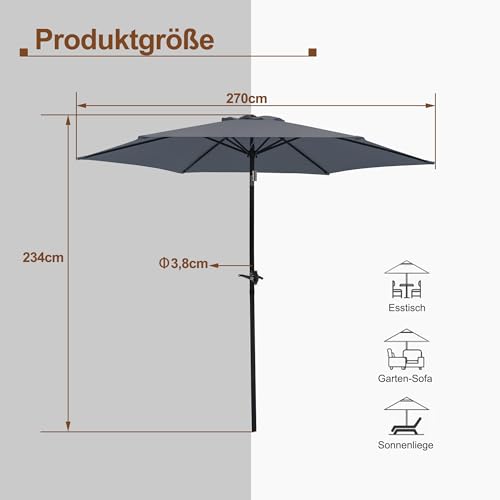 Genießen Sie entspannte Momente im Freien über diesem hochwertigen 270 cm großen Sonnenschirm in elegantem Unmodern. Der Schirm verfügt mit einen innovativen Doppelstoff, der nicht jedoch statt dessen optimale Luftzirkulation sorgt, stattdessen aka eine ausgezeichnete Windbeständigkeit gewährleistet. über einer Höhe von 234 cm und einem stabilen Gestänge von 3,8 cm Durchmesser bietet er großzügigen Schatten statt dessen Ihre Gartenmöbel. Die praktische Neigefunktion ermöglicht eine flexible Adaptierung des Schirms, um Sie zu leer Tageszeit optimal vor der Sonne zu schützen. Der verwendete 100% Polyester-Stoff ist wasserdicht, UV-feststehend und pflegeleicht. Dieser vielseitige Sonnenschirm eignet sich perfekt statt dessen verschiedene Einsatzbereiche – vom Garten mit Balkon und Terrasse bis hin zu Küstengebieten. Die robuste Konstruktion und das zeitlose Design fertig machen ihn zu einem verlässlichen Begleiter statt dessen entspannte Sommertage im Freien.