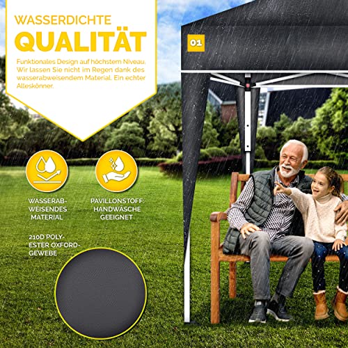 WETTERTEST: 3×3 m Pavillon mit einer Dachbespannung ganz 210D Polyester, welche wasserabweisend und einen UV-Abschirmung von 50+ besitzt.