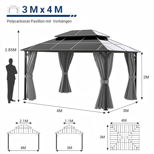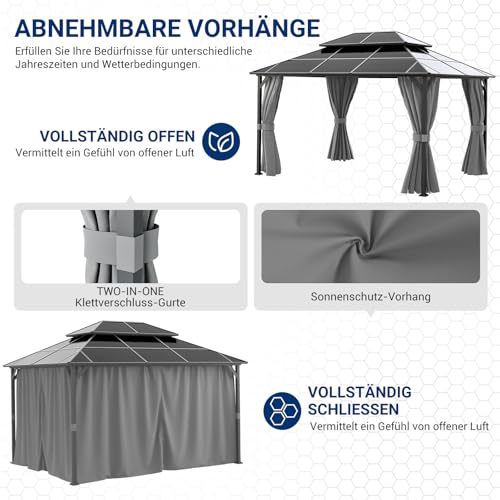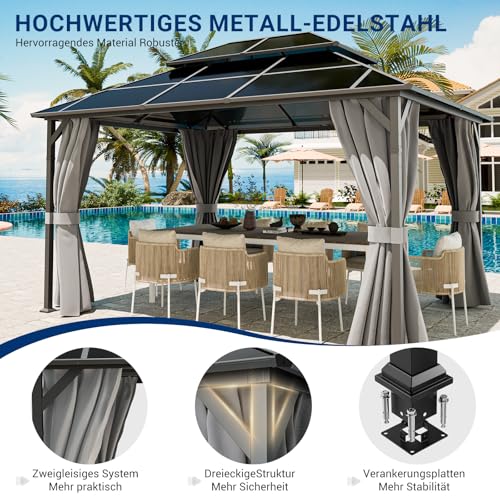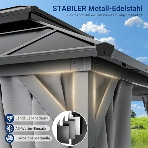 【Wasserdichter & UV-Geschützter Sichtschutzvorhänge】Der Pavillon mit festem Dach verfügt über ein Doppelschienensystem für einfaches Schieben. Abnehmbare Vorhänge sehen nach UV- und Regenschutz, Sie können die Privatsphäre genießen, da ja gleichzeitig eine gute Luftzirkulation und eine weite Aussicht nach draußen gewährleistet sind.