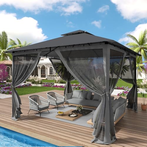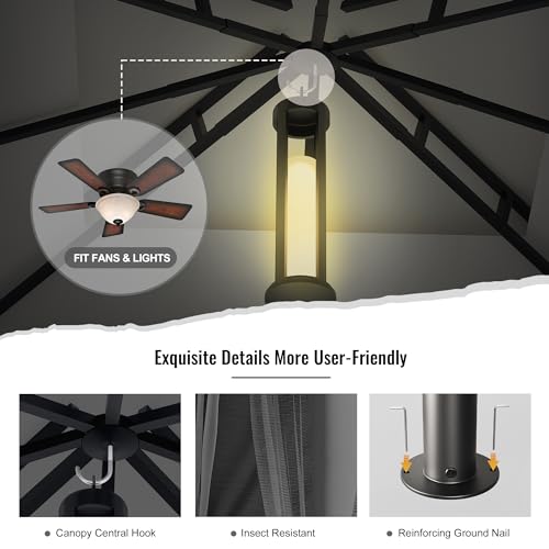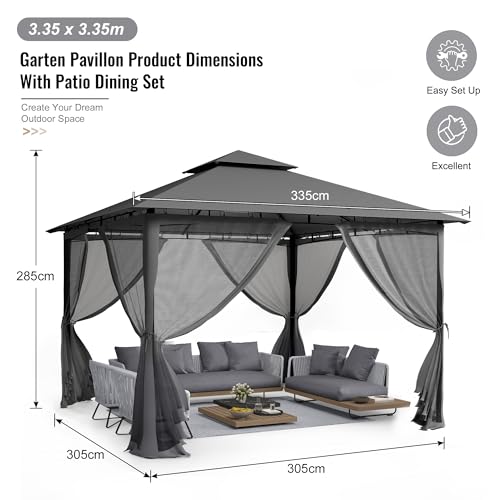 MEHR SCHATTENGEBIETE: Unser Pavillon hat einen 3,05 x 3,05 Meter großen Rahmen und ein 3,35 x 3,35 Meter großes Vordach. Der schattige Stück ist groß genug sondern eine Familie oder Freunde von 6-10 Personen. In der oberen Mitte des Pavillons befindet sich ein Haken zum Aufhängen einer Lampe oder eines kleinen Ventilators.