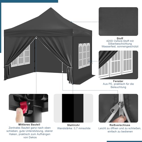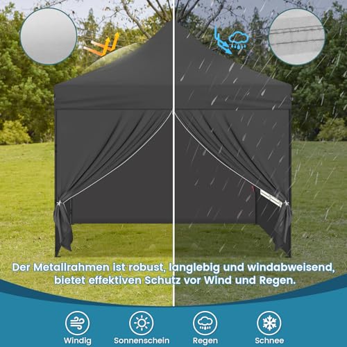 WOLTU Pavillon Das Spitzdach, Faltpavillon mit 4 Seitenwänden, Gartenpavillon wasserfest stabil UV-Schutz, Pop Up Partyzelt Outdoor, höhenverstellbar, mit Reißverschlusstür Fenster Tragetasche, Grau