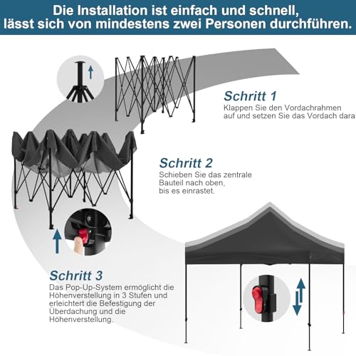 SOLIDE STRUKTUR: Ganz hochwertigem pulverbeschichtetem Eisen gefertigt, ist der Rahmen des Gartenzeltes robust, hart im Nehmen, rost- und kratzfest für den langfristigen Gebrauch. Sie können Lichtbänder oder Option dekorative Accessoires vertrauensvoll an dem Rahmen hängen. Dennoch ist der Rahmen in 3 Höhen verstellbar, um sich an Ihre Bedürfnisse anzupassen