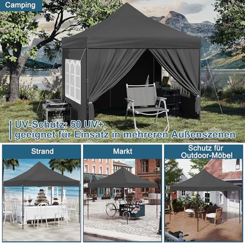 FLEXIBLE NUTZUNG: Dank der 4 abnehmbaren Seitenwände mit Reißverschlusstüren und Fenstern bietet der faltbare Pavillon Sonnenschutz und zugleich gute Belüftung. Bei geöffneten Seitenwänden können Sie die frische Brise genießen und bei geschlossenen sind Sie vor Wind, Regen und Insekten geschützt. Der Faltpavillon bietet bequemen Schatten für Aktivitäten im Freien
