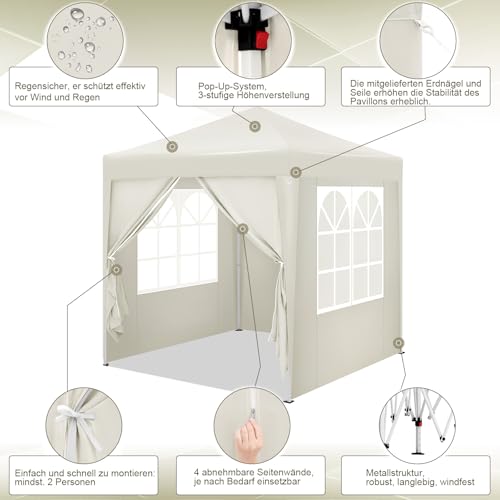 WOLTU Pavillon, Faltpavillon 2×2 m, mit 4 Seitenwänden, Partyzelt wasserabweisend UV-Schutz 50+, höhenverstellbarer Gartenpavillon, mit Tragetasche, für Outdoor Garten Camping, Beige