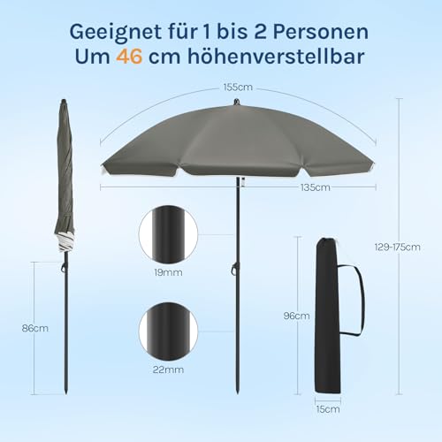 WOLTU Sonnenschirm Balkon Ø135cm, UV-Schutz Strandsonnenschirm UPF 50+, Höhen- und Neigungsverstellbar, Tragetasche, Runder Gartenschirm für Balkon, Garten, Strand, Dunkelgrau