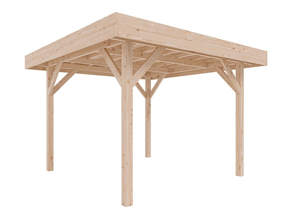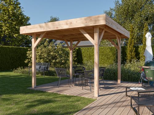 Woodtex Pavillon Gartenlaube | BxTxH: 356 x 356 x 250,8 cm | Sockelmaß BxT: 306 x 306 cm | Pfostenstärke: 11,5 x 11,5 cm | Douglasie-Holz | Flachdach