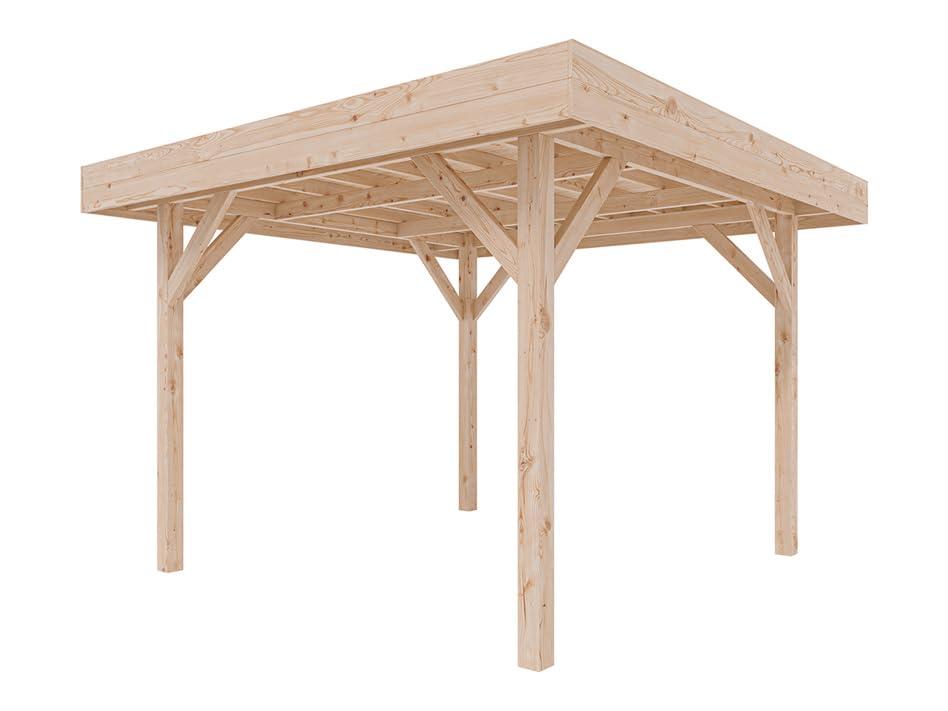 Form: 4-eckig – Sockelmaß (B x T): 306 x 306 cm – Außenmaß (B x T): 356 x 356 x 250,8 cm – Innenmaß: 283 x 283 cm – Firsthöhe (cm): 250,80 cm – Grundfläche (m²): 8,01 m² – Holzart: Douglasie – Bauweise: abgetaut – Oberflächenbehandlung: unbehandelt – Dachform: Flachdach – Pfostenanzahl: 4 – Pfostenstärke (cm): 11,5 x 11,5 cm – Farbe: Naturbelassen