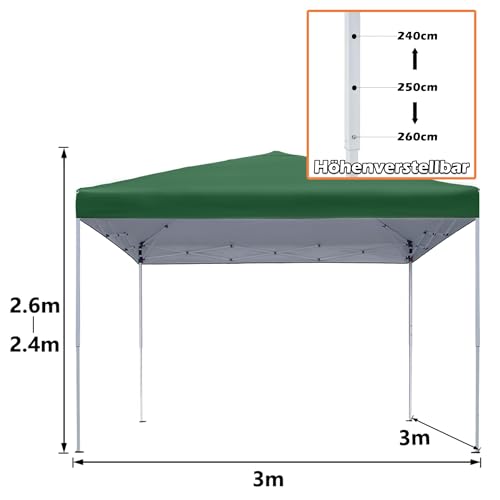 Breiter Einsatzbereich: Die Höhe dieses Faltpavillons kann von 2,4 m bis 2,6 m verstellt werden, so dass Sie ihn an Ihre aktuelle Situation gleichsetzen können. Er eignet sich perfekt für Camping, Partys, Grillfeste, Flohmarktstände, Sportveranstaltungen im Freien und Schulveranstaltungen.
