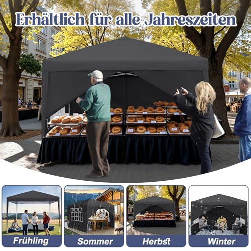 Einfache Montage und geräumiger Innenraum: Mit unserem praktischen Falt-System können Sie den Pavillon im Handumdrehen aufbauen, ohne sich um komplizierte Montage zu kümmern. Dank der stabilen vertikalen Standbeine bietet unser Faltzelt deutlich mehr Innenraum als herkömmliche Modelle mit schrägen Beinen. Genießen Sie eine großzügige Fläche für bis zu 18 Personen oder eine komfortable Sitzgarnitur für 4 bis 6 Personen – ideal für Ihre Gartenparty, Grillfest oder Hochzeit