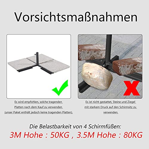 2. Die Belastbarkeit von 4 Schirmfüßen: 3M Höhe: 50KG, 3.5M Höhe: 80KG.