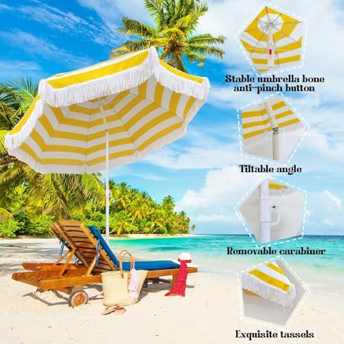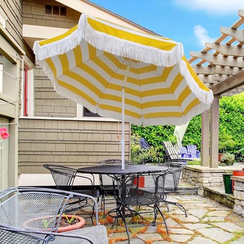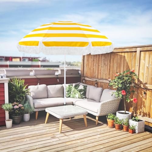 XOBRJQZ 180cm gelb gestreifter Boho-Sonnenschirm mit Fransen, tragbarer Strandschirm mit Kippstange, leicht zu tragen, höhenverstellbar