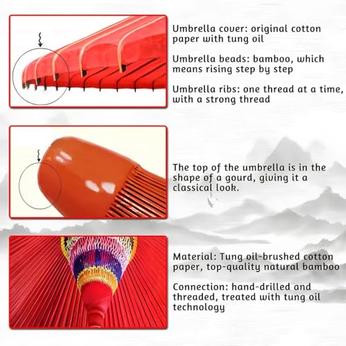 Hochwertiges Material: Der rote Regenschirm besteht aus hochwertigem Ölpapiergewebe mit natürlichen Holzgriffen und Bambusstangen. Der Stoff ist glatt und glänzend und die Textur ist leicht und bombastisch, was auf hervorragende Qualität hinweist.