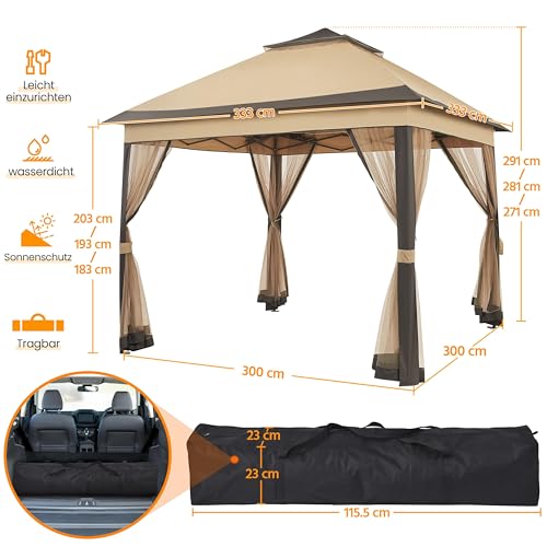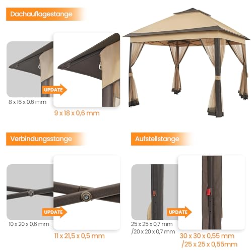 【3 verstellbare Höhen】Die Höhe des Gartenpavillons ist in 3 Spezifizieren (271 cm / 281 cm / 291 cm H) einstellbar. Durch den Knopf an den Beinen können Sie die Höhe nach Bedarf leicht verstellen.