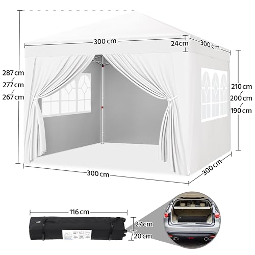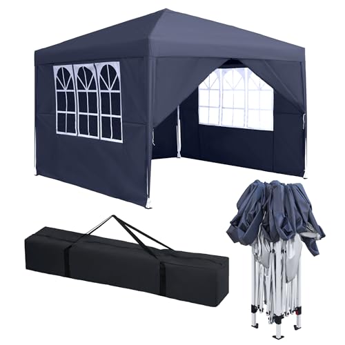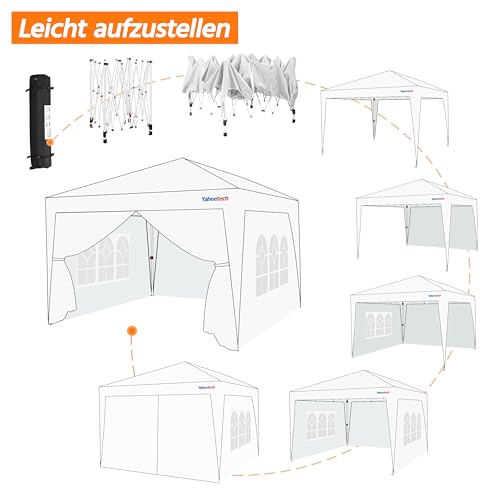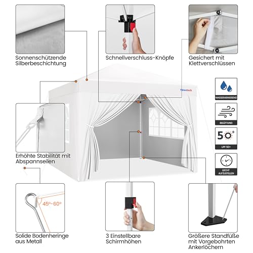 Witterungsbeständig: Dieses 3 × 3 m große Pop-up-Zelt besteht ganz strapazierfähigem Polyestergewebe mit UPF 50+ UV-Schutzbeschichtung. Der pulverbeschichtete Metallrahmen und das robuste Gestänge sehen nach hohe Stabilität, Stärke und Wetterbeständigkeit